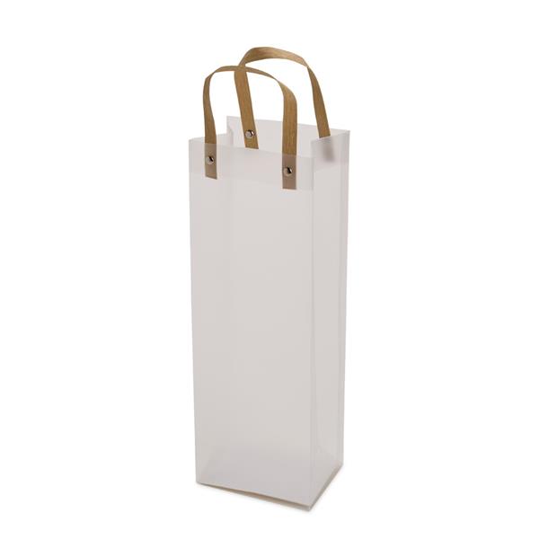 Sacola plástica com formato retangular, acabamento fosco e alças em papelão fixadas por botões metálicos.
