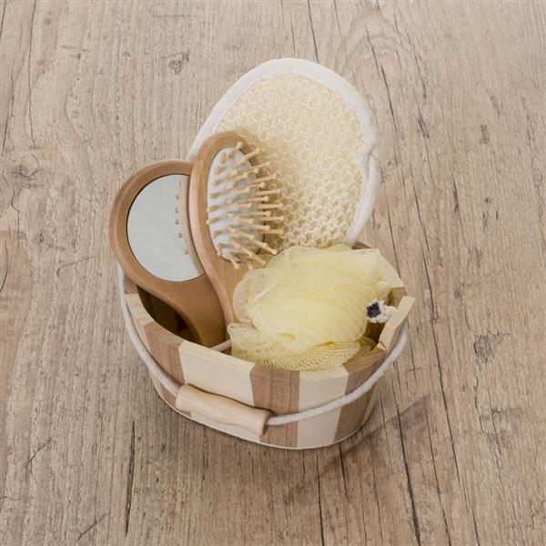 Kit banho de madeira com 5 peças. Possui: espelho, escova de cabelo, esponja de banho, bucha de banho e massageador. Acompanha balde com alça e pegador de madeira. OBS.: PEDIDO MÍNIMO 10 PEÇAS! Tamanho total aproximado (CxL): Espelho 14,8 cm x 7,1 cm – Escova 15,9 cm x 4,1 cm x Esponja 10 cm x 10 cm – Bucha 13,8 cm x 9,5 cm – Massageador 11,8 cm x 5,9 cm – Balde 15,8 cm x 6,9 cm x 11 cm Peso aproximado (g): 235