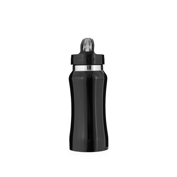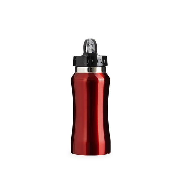 Squeeze em inox com capacidade para até 500 ml. Possui tampa rosqueável em plástico com alça fixa e bico flip. Acompanha canudo interno removível e mosquetão metálico com argola.