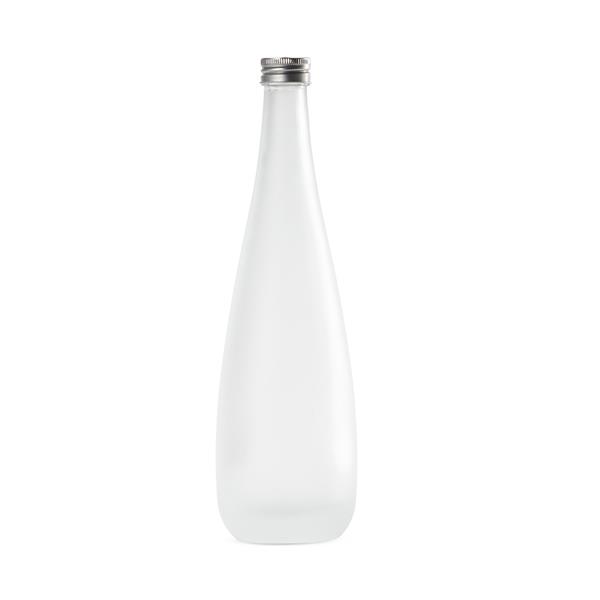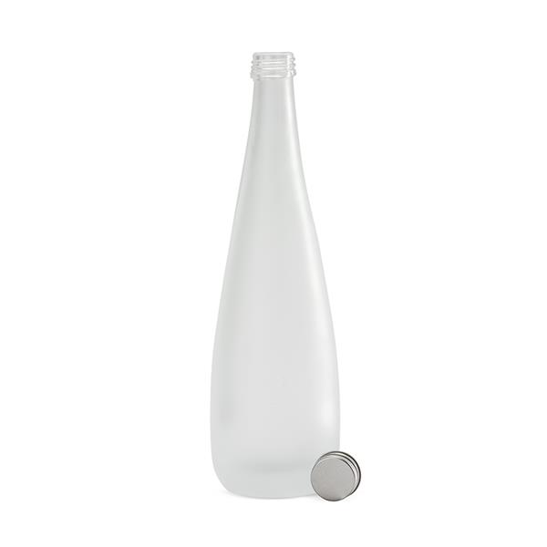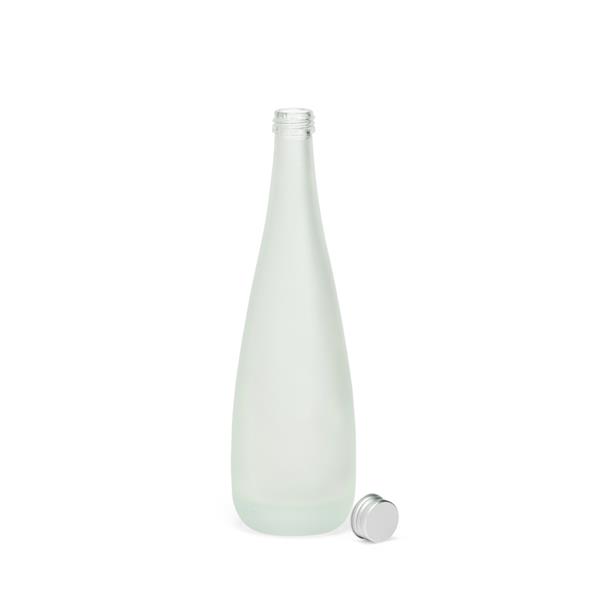 Garrafa de vidro com acabamento fosco, tampa rosqueável em alumínio e capacidade máxima de 550 ml.