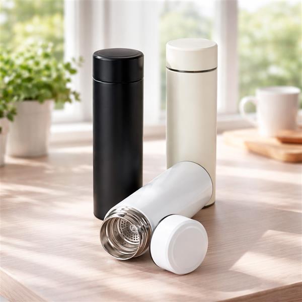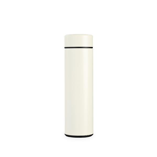 Garrafa térmica de parede dupla, com parte externa em inox 201 e pintura aplicada por spray, e camada interna em inox 304. Possui capacidade de até 400 ml, tampa rosqueável com parte interna em polipropileno (PP) e anel de vedação emborrachado, além de base antiderrapante em PP. Acompanha cesto infusor com alça em inox 304.