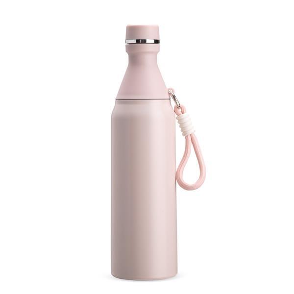 Garrafa térmica em inox com capacidade para até 500 ml. Possui estrutura de parede dupla, ideal para conservar a temperatura de líquidos por mais tempo. Conta com tampa rosqueável e compartimento removível em plástico, permitindo o uso como copo. Acompanha alça em nylon com detalhes em plástico e mosquetão metálico. Altura : 26,2 cm Largura : 7,1 cm Diâmetro : 5,5 cm Peso aproximado (g): 217