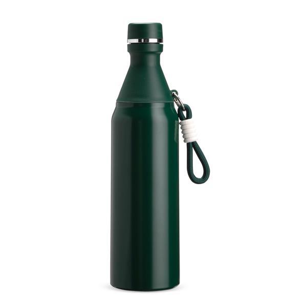 Garrafa térmica em inox com capacidade para até 500 ml. Possui estrutura de parede dupla, ideal para conservar a temperatura de líquidos por mais tempo. Conta com tampa rosqueável e compartimento removível em plástico, permitindo o uso como copo. Acompanha alça em nylon com detalhes em plástico e mosquetão metálico.