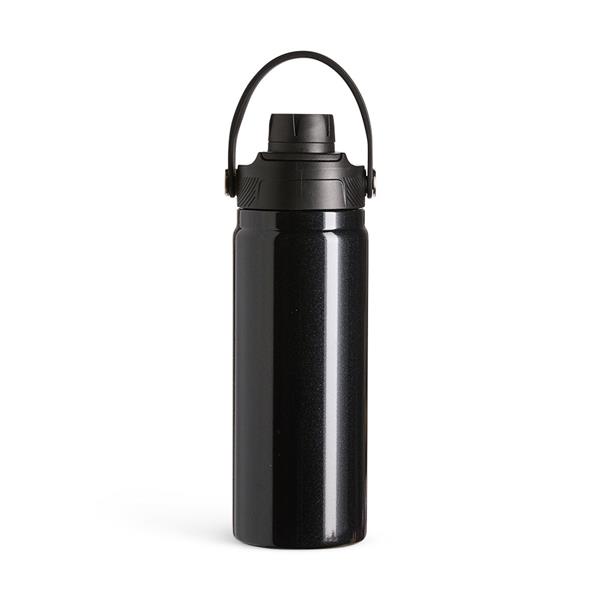 Garrafa térmica em inox com capacidade de até 600ml. Apresenta estrutura com parede dupla e isolamento a vácuo, permitindo conservar a temperatura de líquidos por mais tempo. Possui tampa plástica rosqueável com proteção para o bocal e alça fixa para transporte.