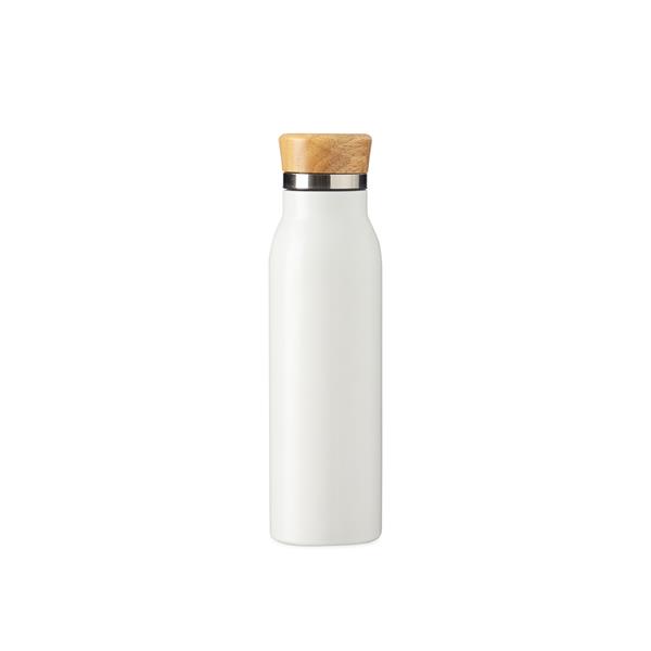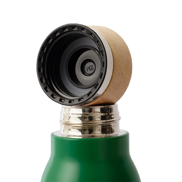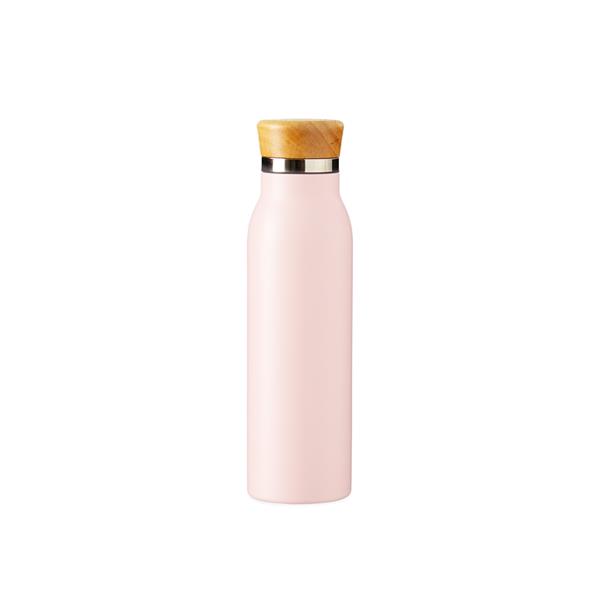Garrafa térmica feita em inox com pintura em spray, tampa rosqueável em bambu e capacidade máxima de 600ml. Possui estrutura de parede dupla e isolamento a vácuo, permitindo manter a temperatura de líquidos por mais tempo.