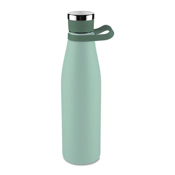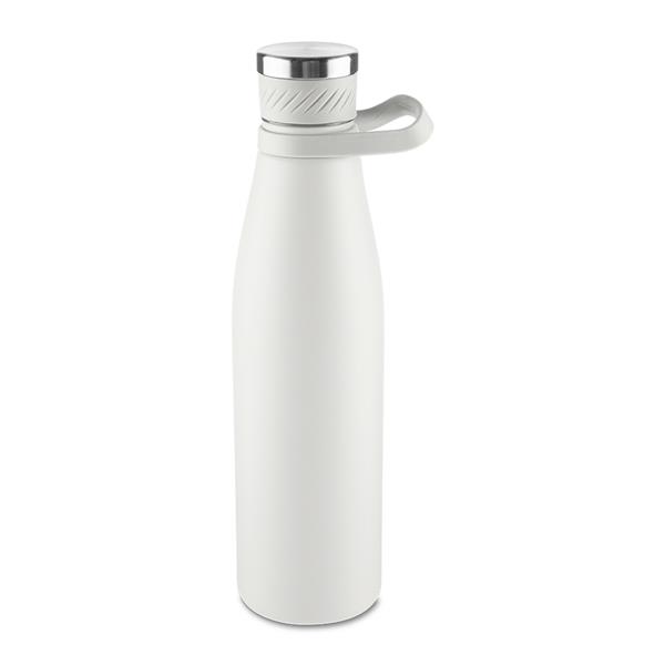 Garrafa térmica em inox com pintura eletrostática capacidade máxima de 750 ml. Possui estrutura de parede dupla e vedação a vácuo, que permite conservar a temperatura de líquidos quentes ou frios por mais tempo. Conta ainda com tampa rosqueável em inox, com revestimento externo em silicone, e acompanha alça removível em silicone para transporte.