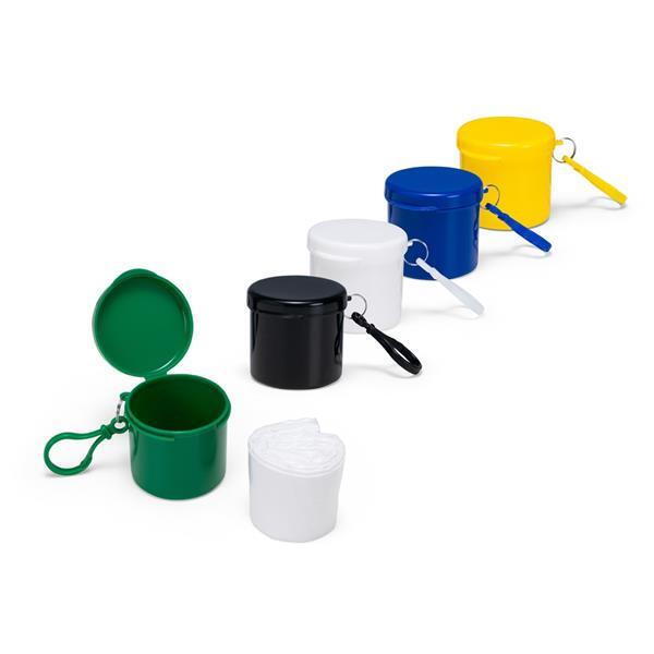 Capa de chuva descartável em plástico. Acompanha embalagem plástica em formato cilíndrico com mosquetão.