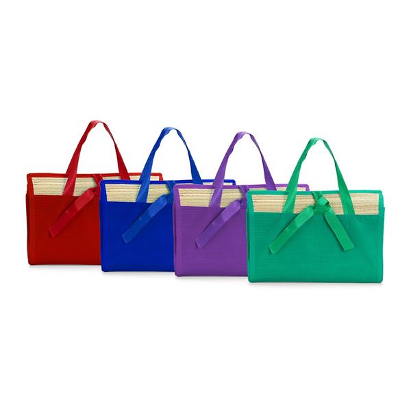 Esteira dobrável em palha sintética com bordas costuradas em nylon dividindo a esteira em três partes. Além disso, possui um par de alças costuradas para transporte.