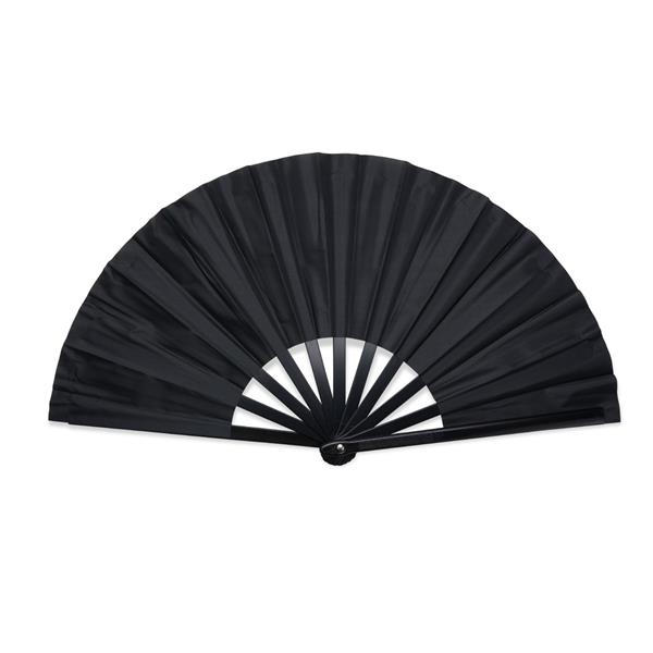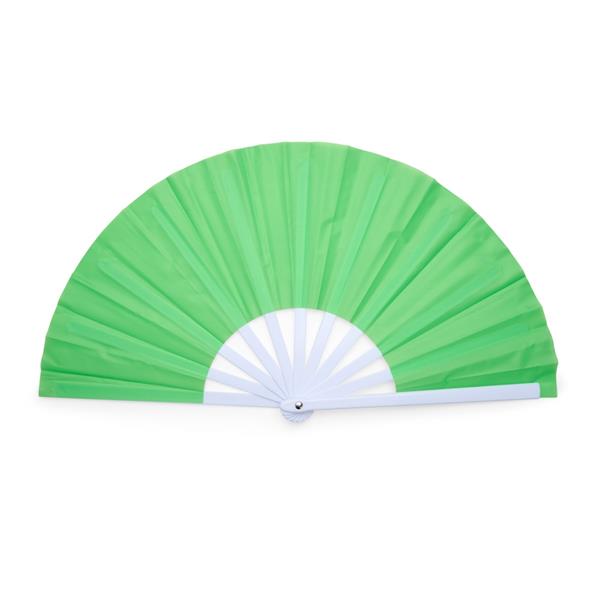 Leque com estrutura resistente em plástico e tecido leve.