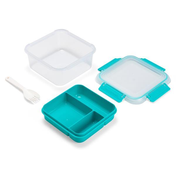 Marmita em plástico polipropileno (PP) livre de BPA com capacidade máxima de 1 litro combinada com a divisória removível. Possui tampa hermética com anel de vedação em silicone e quatro travas laterais. Acompanha colher tipo spork em PP. Altura : 7,9 cm Largura : 16,7 cm Profundidade : 12 cm Peso aproximado (g): 216