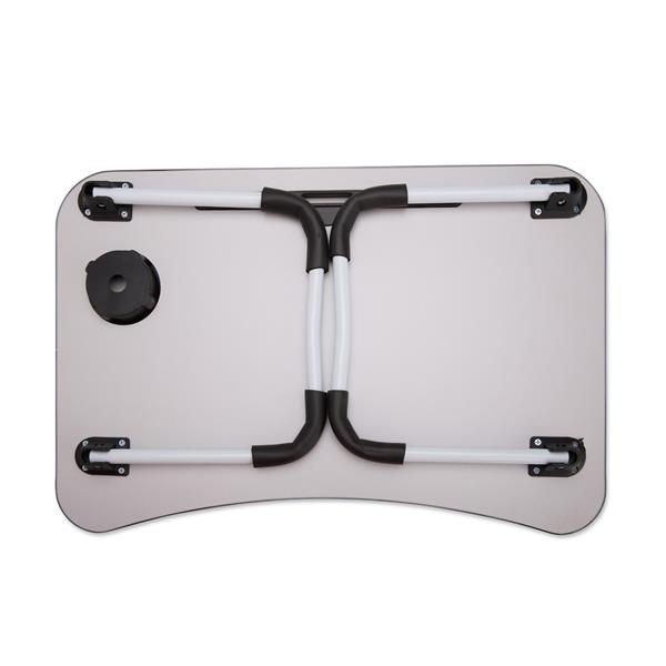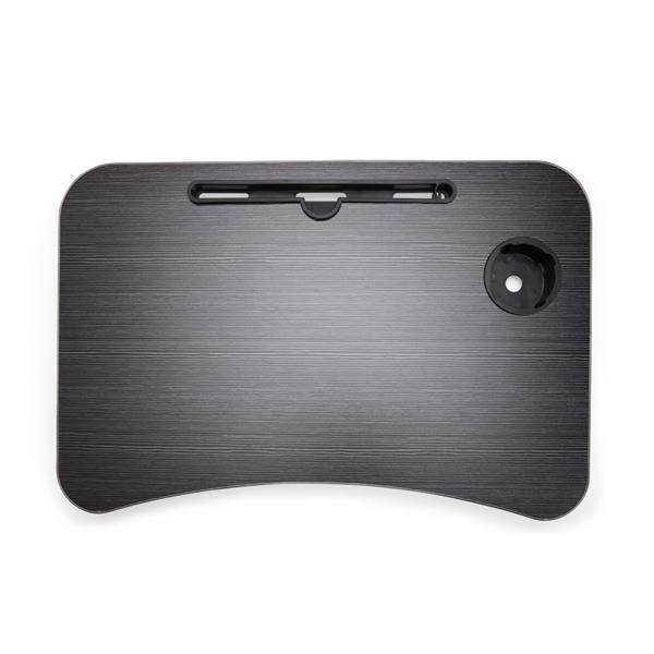 Mesa portátil multiuso feita em MDF com pernas dobráveis em metal revestidas com espumas antiderrapante e detalhes em plástico. Suporta notebooks de até 15,3 polegadas conta com suportes para copos e dispositivos móveis, como celulares e tablets.