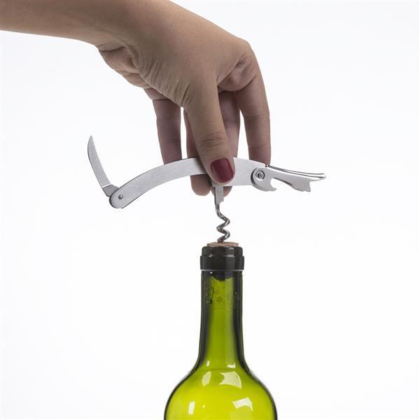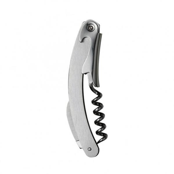 Saca rolhas metálico com lâmina de corte e abridor de garrafa. Material: Metal Comprimento: 10,7 cm Largura: 2,7 cm Medidas para gravação (A x L): 1 cm x 5,8 cm Peso: 63 g