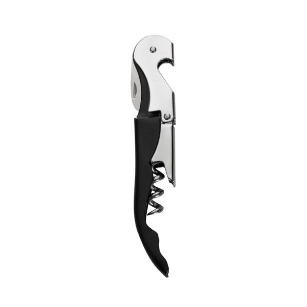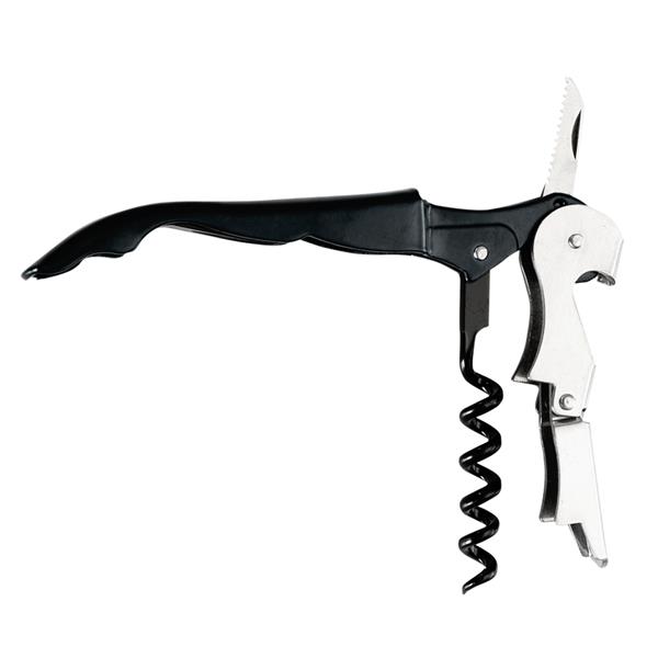 Saca rolhas metálico com lâmina de corte e abridor de garrafa. Metal com aparência brilhante.