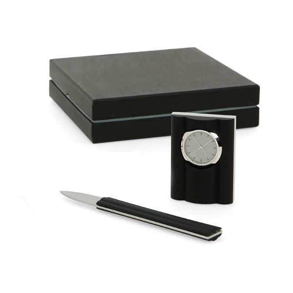 Conjunto para mesa de escritório. Metal e acrílico. 4 peças: relógio de mesa, extrator de grampo, porta papel e esferográfica. Incluso bloco. Caixa: 225 x 225 x 58 mm