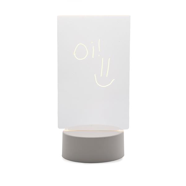 Luminária de mesa com luz Led, tela acrílica e base plástica. Acompanha caneta plástica com apagador integrado, tela 3D acrílica, base Led luminosa com cabo USB e espaço para 3 pilhas AA 1.5V . Altura : 19,3 cm Largura : 10 cm Circunferência : 27,2 cm Espessura : 0,3 cm Peso aproximado (g): 133