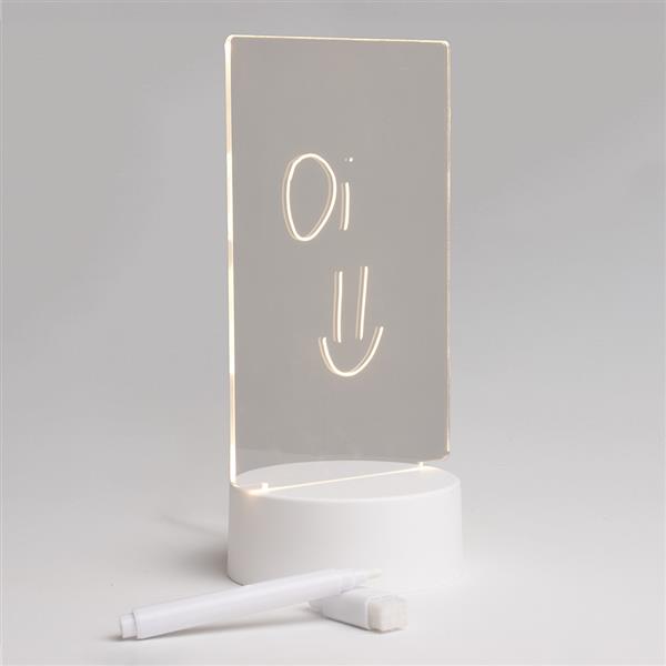 Luminária de mesa com luz Led, tela acrílica e base plástica. Acompanha caneta plástica com apagador integrado, tela 3D acrílica, base Led luminosa com cabo USB e espaço para 3 pilhas AA 1.5V .