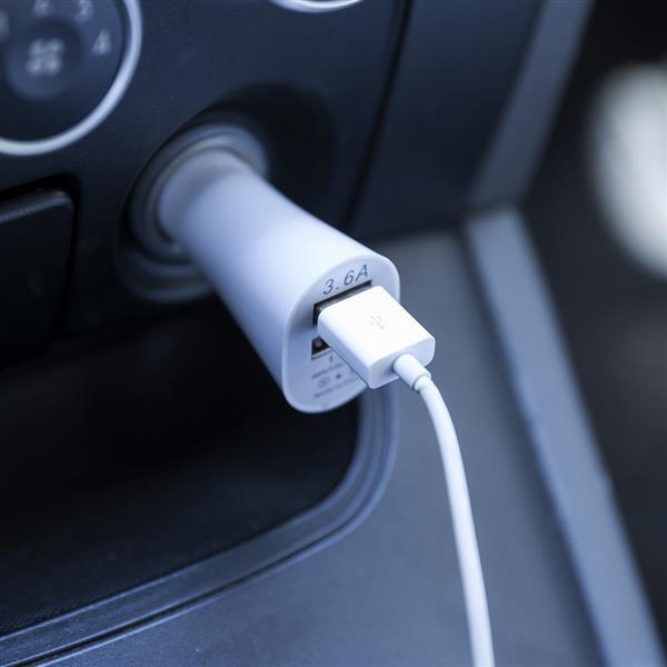 Carregador veicular de plástico na cor branca com detalhes prata. Entrada 12-24V e Saídas de 1.0A e 2.1A. Basta encaixar na tomada acendedor do carro e conectar à um cabo USB(não acompanha). Largura : 3,6 cm Espessura : 2,5 cm Comprimento : 10,2 cm Medidas aproximadas para gravação (CxL): 2 cm x 4,5 cm Peso aproximado (g): 16