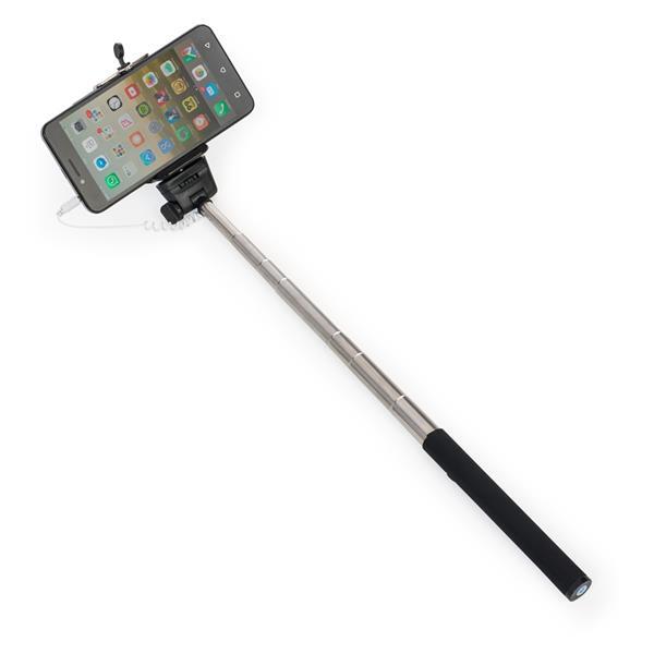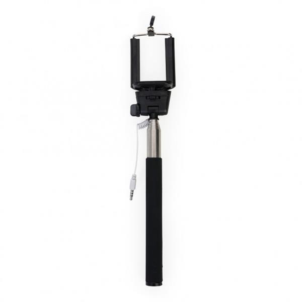 Bastão de selfie alumínio com detalhe emborrachado preto. Para utilizar basta conectar o cabo P2 no aparelho celular/tablet e apertar o botão no próprio bastão para bater a foto. Possui suporte plástico regulável, válvula lateral do bastão para ajuste de posicionamento e válula central para apertar o suporte. Suporte ajusta até 8,4cm de largura para encaixar celular, bastão estende até 81,8 cm de comprimento. Medidas aproximadas para gravação (CxL): 3,3 cm x 1,3 cm Tamanho total aproximado (CxL): 23 cm x 4,8 cm Peso aproximado (g): 116