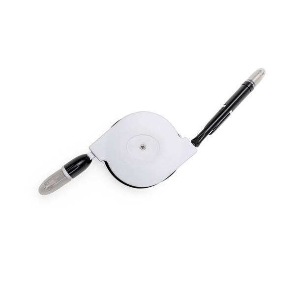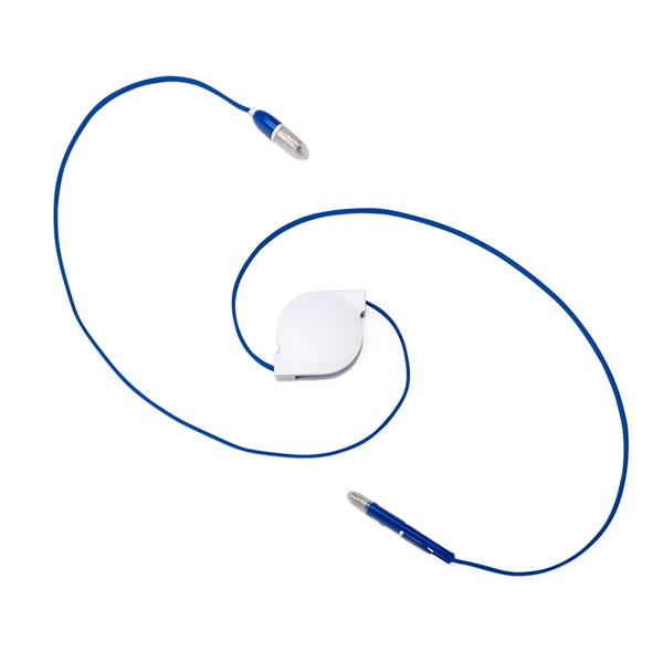 Cabo de dados retrátil 3 em 1. possui entradas: V8/Android, Lightning/Iphone e USB Type-C/novos Androids. A saída V8 é a mesma saída para o Lightning, cada lado da peça carrega um tipo de aparelho, basta inverter a posição ao encaixar. Além de recarregar, também transfere dados. Suporte plástico branco de frente lisa e verso com detalhe oval (com parafuso no centro). Possui rolamento com trava automática, os dois lados de cabo devem ser puxados simultaneamente e ao soltar irão travar. Não puxar um cabo por vez para não embolar. Medidas aproximadas para gravação (CxL): 3 cm x 3 cm Tamanho total aproximado (CxL): Base 4,1 cm x 5,8 cm – Cabo 101,3 cm Peso aproximado (g): 35
