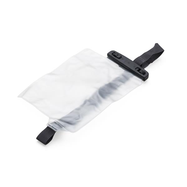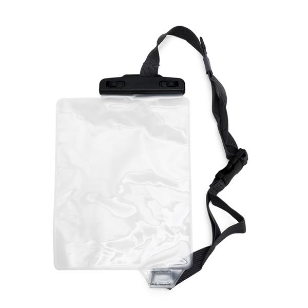 Capa impermeável para itens diversos. Parte frontal transparente e verso fosco, suporte plástico preto com fivelas rotatórias(basta rotacioná-las para abrir o case). Possui alça de nylon ajustável com fivela plástica. Altura : 29 cm Largura : 18 cm Medidas aproximadas para gravação (CxL): 21,5 cm x 17 cm Tamanho total aproximado (CxL): Alça 96,8 cm Peso aproximado (g): 77