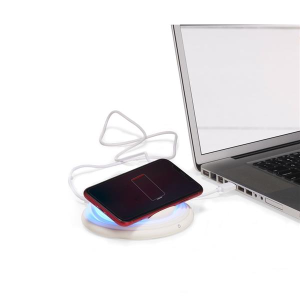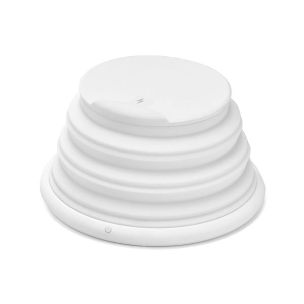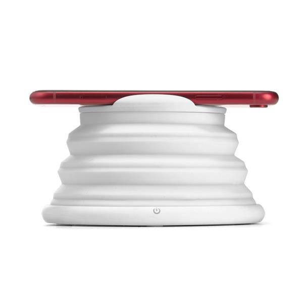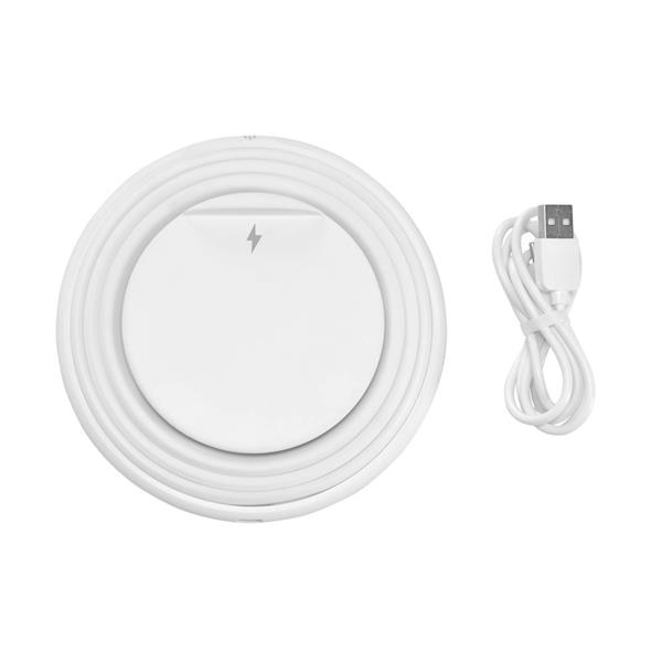 Carregador retrátil por indução com luminária. Produzido em silicone e plástico ABS, o carregador possui entrada type-C e funciona apenas enquanto conectado à uma fonte de energia, o produto não armazena carga. O acionamento e troca de luzes da luminária é realizado através do botão power na base do produto, possui os modos de cores: branco, exibição RGB alternada, vermelho, azul e verde. O carregamento por indução só é compatível com celulares que possuam tecnologia QI. Entrada 5V / 2A; Saída 5V / 1A; Eficiência 110KHZ – 220KHZ; Eficiência do carregamento =70%; Potência 5W. Altura : 2,8 cm Largura : 13,8 cm Comprimento : 13,8 cm Medidas aproximadas para gravação (CxL): 6 cm x 8 cm Tamanho total aproximado (CxL): 8,1 cm aberto Peso aproximado (g): 189