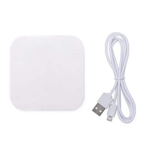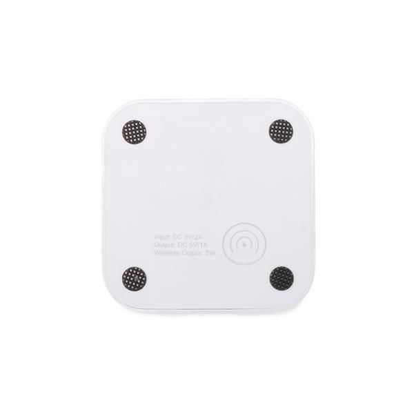 Hub com carregamento por indução, contém duas saídas USB para conexão ou carregamento via cabo. Base borrachas antiderrapantes na área inferior. Acompanha cabo USB. Material: Plástico Comprimento: 9,9 cm Largura: 9,9 cm Espessura: 0,9 cm Medidas para gravação (C x L): 8,8 cm x 8,8 cm Peso: 66 g Entrada: 5V/2A Saídas: 5V/1A Wireless: 5W Requisito para carga de indução: Eletrônico com padrão QI
