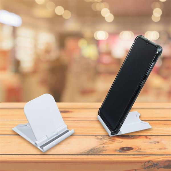 Suporte plástico para celular, base e “canaleta” com silicone antiderrapante. Material: Plástico ABS Altura - aberto: 6,5 cm Comprimento: 8 cm Largura: 6 cm Espessura - fechado: 0,9 cm Medidas para gravação (C x L): 5 cm x 5 xm Peso: 22 g