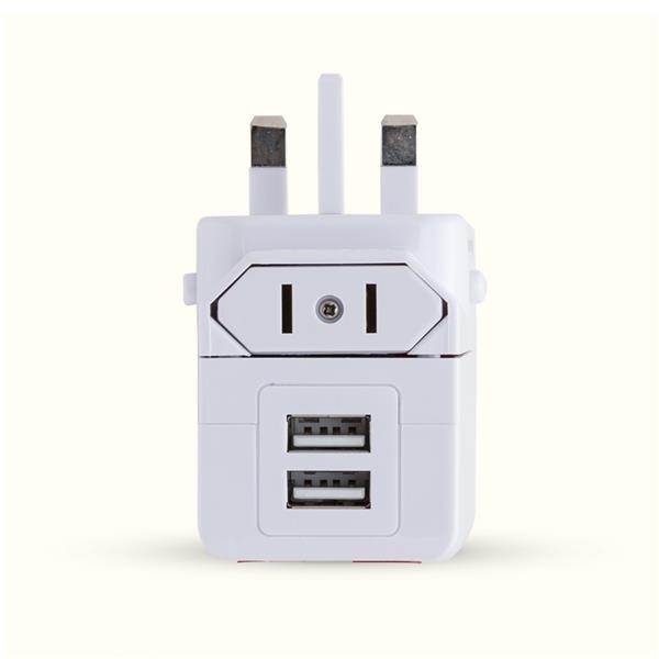 Adaptador universal branco em plástico resistente. Possui os plugs/tomadas: UK/SP; USA/JAPAN/AUST/THAI , Europe e duas entradas USB. Ao segurar simultaneamente os botões release na lateral é póssível desencaixar parte do adaptador para utilização dos outros plugs, possui dois fusíveis removíveis(não funciona sem o fusível). Quando conectada à energia, uma luz ficará acesa no AC POWER, quando conectado cabo USB acenderá uma luz no USB. Entrada AC100V~250V~50/60Hz; Saída AC100~250V~50/60Hz; USB 5.0VDC/ 1000mA, Europe 250V~3A. Acompanha saquinho TNT e manual de instruções em inglês. Medidas aproximadas para gravação (CxL): 1,8 cm x 3,5 cm Tamanho total aproximado (CxL): 6,1 cm x 7,9 cm x 5 cm Peso aproximado (g): 95