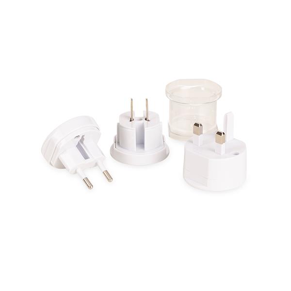 Adaptador universal branco em plástico resistente com detalhe acrílico. Possui plug EU(EUROPA), Plug UK(INGLATERRA) e Plug USA/AU(ESTADOS UNIDOS/AUSTRÁLIA). Entrada 110v-250v 10A. Acompanha saquinho tnt para transporte do adaptador. Obs.: Este adaptador não converte voltagem, não utilizar com secador de cabelo, capacidade máxima 110-MAX 1430W e 250V-MAX 3250W e quando não estiver sendo utilizado deverá desconectá-lo. Medidas aproximadas para gravação (CxL): 1,6 cm x 5 cm Tamanho total aproximado (CxL): 8,7 cm x 4,7 cm x 15,1 cm Peso aproximado (g): 88