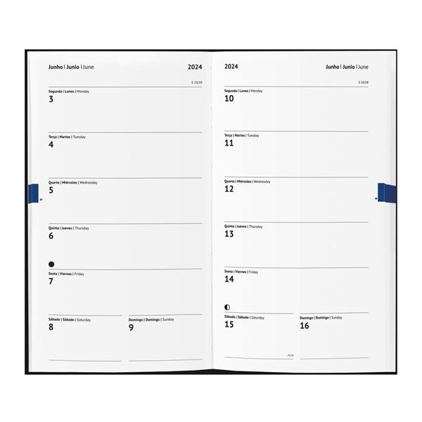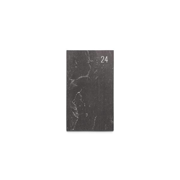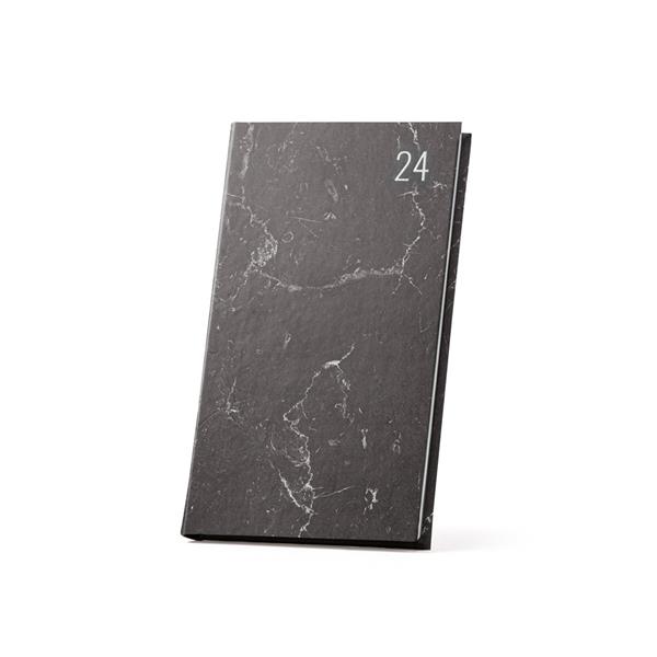 Agenda de bolso com capa rígida em papel pedra e marcador em fita, com aspeto mármore e cantos retos. Está organizada num plano bissemanal. 85 x 145 mm