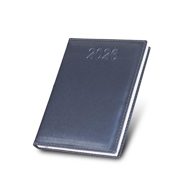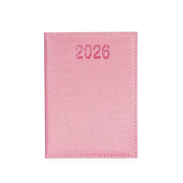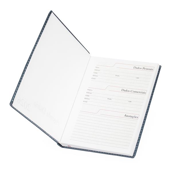 Agenda diária 2026 com capa em couro sintético metalizado e marca-páginas em fita de cetim. Possui páginas dedicadas a dados pessoais, calendários de 2025 a 2027, lista de contatos, planejamento diário e mapas. OBS.: PEDIDOS APENAS MÚLTIPLOS DE 10 PEÇAS! Altura : 20 cm Largura : 14,7 cm Espessura : 2 cm Peso aproximado (g): 371