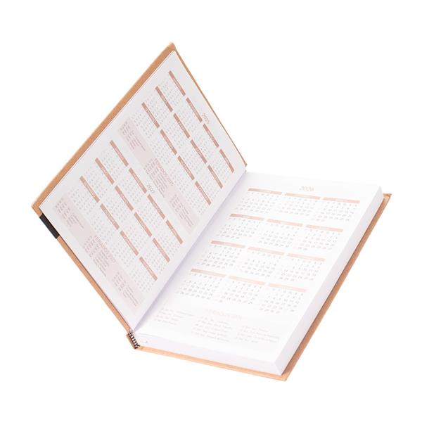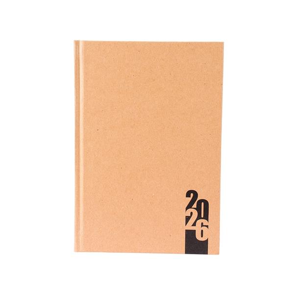 Agenda diária modelo 2026 de capa dura em kraft e marcador de páginas em fita de cetim. Apresenta páginas dedicadas à dados pessoais, calendários de 2025 até 2027, orçamentos pessoais, anotações, planejamento mensal, endereços de contato e mapas. Altura : 20,5 cm Largura : 14,1 cm Espessura : 2 cm Peso aproximado (g): 401