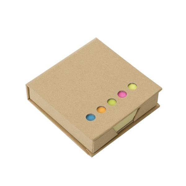 Bloco de anotações ecológico quadrado com autoadesivos. Possui 5 furos na tampa equivalente aos autoadesivos coloridos internos que tem aproximadamente 20 folhas e bloco amarelo com aproximadamente 150 folhas. Medidas aproximadas para gravação (CxL): 7 cm x 9 cm Tamanho total aproximado (CxL): 10,4 cm x 10 cm x 2,7 cm Peso aproximado (g): 138