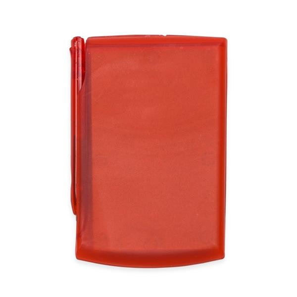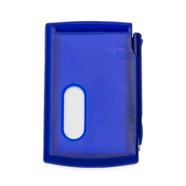 Bloco de anotações plástico com autoadesivos e caneta. A caneta fica localizada na lateral frontal, possui um encaixe no versa dela que também serve para fechar o bloco. Capa com detalhes e verso liso, parte interna com cinco blocos autoadesivos com aproximadamente 20 folhas cada e bloco de rascunho branco com aproximadamente 50 folhas Medidas aproximadas para gravação (CxL): 3 cm x 9 cm – Caneta 5 cm x 0,7 cm Tamanho total aproximado (CxL): 7,1 cm x 11,1 cm – Caneta 9 cm x 1,1 cm Peso aproximado (g): 63
