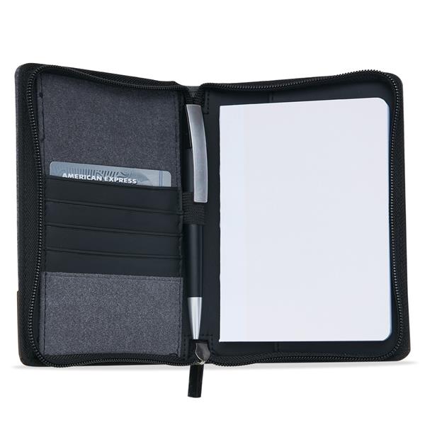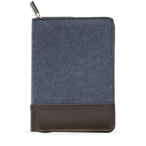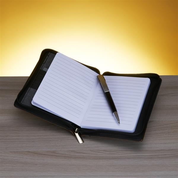 Bloco de anotações executivo com zíper. Capa de feltro com detalhe inferior em couro sintético, parte interna possui 5 divisões para cartões, aproximadamente 80 folhas amarelas pautadas e contra capa com suporte em feltro para caneta(não acompanha) Medidas aproximadas para gravação (CxL): 3,3 cm x 10 cm Tamanho total aproximado (CxL): 15,5 cm x 11,4 cm x 2,1 cm Peso aproximado (g): 169