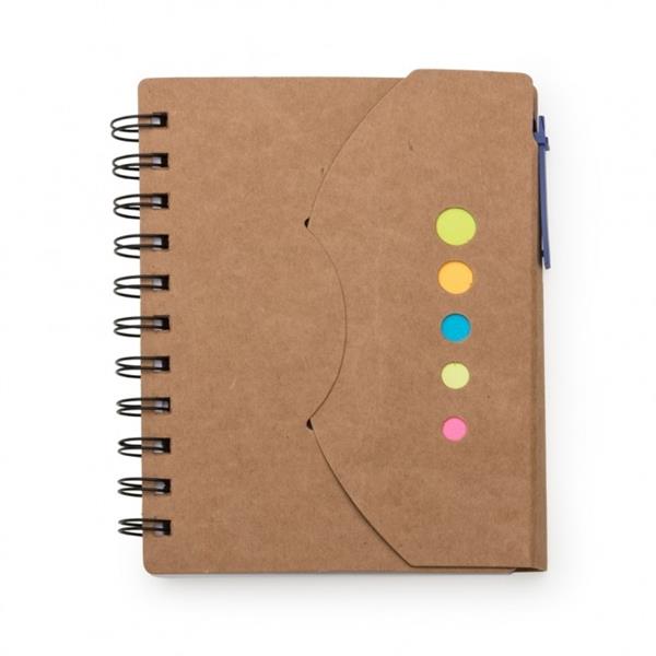 Bloco de anotações ecológico com caneta e autoadesivos. Bloco com fechamento lateral tipo “envelope e com espiral preto lateral. Possui cinco furos na capa referente aos blocos autoadesivos internos com 25 folhas cada, bloco com aproximadamente 70 folhas brancas pautadas e caneta de papelão de clip e ponteira plástica. Altura : 15,6 cm Largura : 13 cm Medidas aproximadas para gravação (CxL): 15 cm x 3,5 cm - Caneta 3,7 cm x 0,7 cm Tamanho total aproximado (CxL): Caneta 14 cm x 1,5 cm Peso aproximado (g): 118