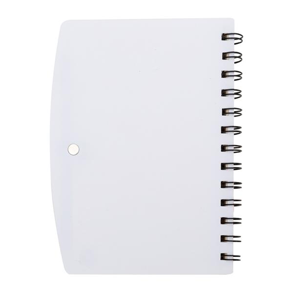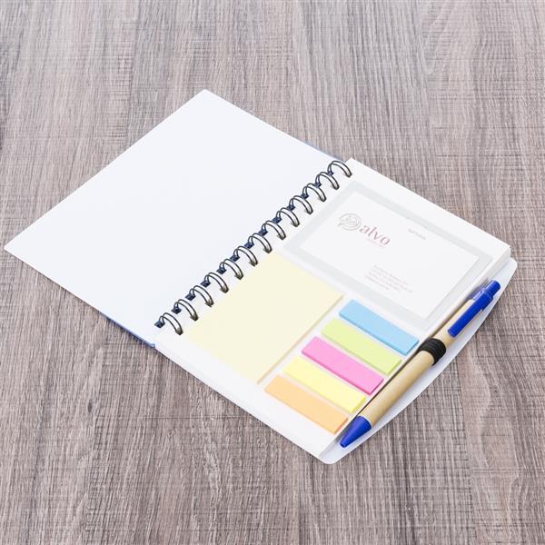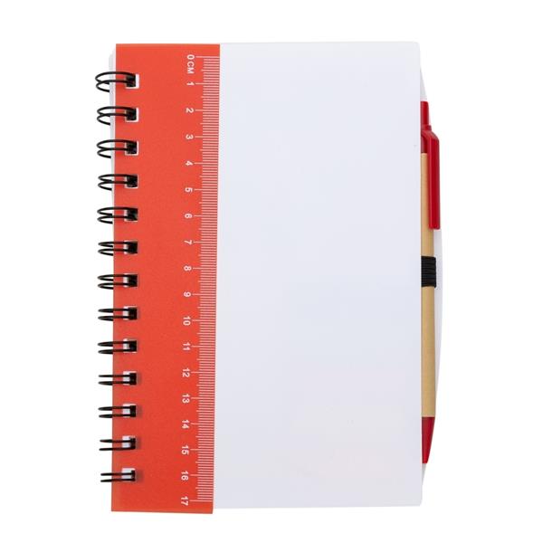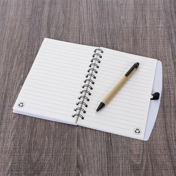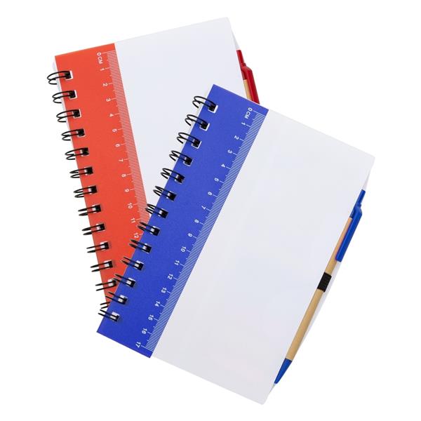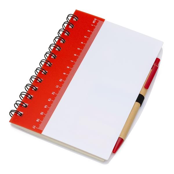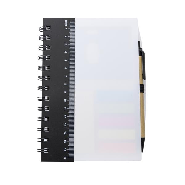 Bloco de anotações multiuso capa branca com espiral preto. Possui: régua de 17cm na capa, porta cartão plástico, cinco blocos autoadesivos coloridos com 25 folhas cada, bloco amarelo com 25 folhas, 70 folhas pardas pautadas com logo reciclado no canto inferior direito e suporte elástico com caneta ecológica de papelão(clip e ponteira plástico). Medidas aproximadas para gravação (CxL): 16 cm x 7,6 cm Tamanho total aproximado (CxL): 17,7 cm x 13,5 cm Peso aproximado (g): 151