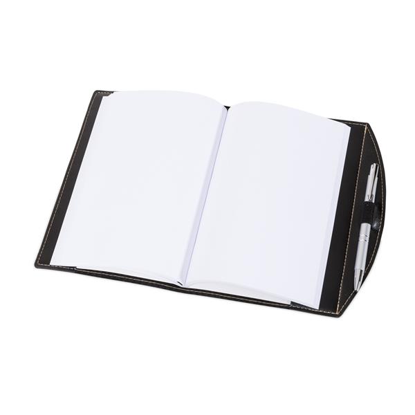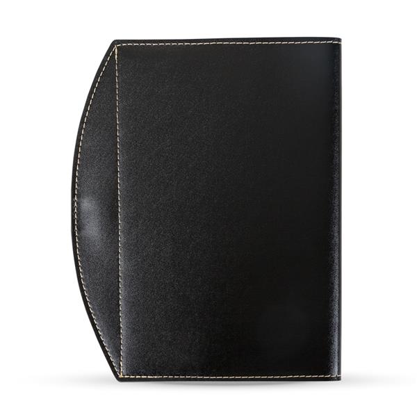 Bloco de anotações Bidins com caneta plástica. Bloco de couro sintético com frente e verso liso, possui aproximadamente 80 folhas brancas sem pauta, marca página de cetim, suporte elástico para caneta na lateral e acompanha caneta plástica com três anéis inferiores Medidas aproximadas para gravação (CxL): 20,7 cm x 13 cm – Caneta 3 cm x 0,7 cm Tamanho total aproximado (CxL): 22 cm x 17,5 cm – Caneta 13,7 cm x 1,2 cm Peso aproximado (g): 284
