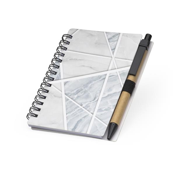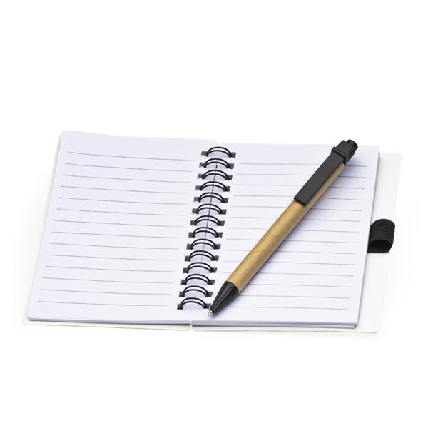 Caderneta com capa em papel com acabamento brilhoso e porta caneta, possui aproximadamente 70 folhas brancas pautadas. Acompanha caneta de papelão com detalhes plásticos, carga esferográfica azul e acionamento por clique. Altura : 13,5 cm Largura : 10,5 cm Espessura : 1,5 cm Peso aproximado (g): 80