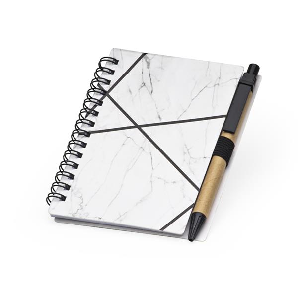Caderneta com capa em papel com acabamento brilhoso e porta caneta, possui aproximadamente 70 folhas brancas pautadas. Acompanha caneta de papelão com detalhes plásticos, carga esferográfica azul e acionamento por clique. Altura : 13,5 cm Largura : 10,5 cm Espessura : 1,5 cm Peso aproximado (g): 80