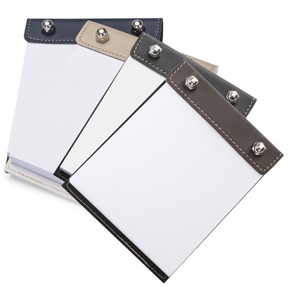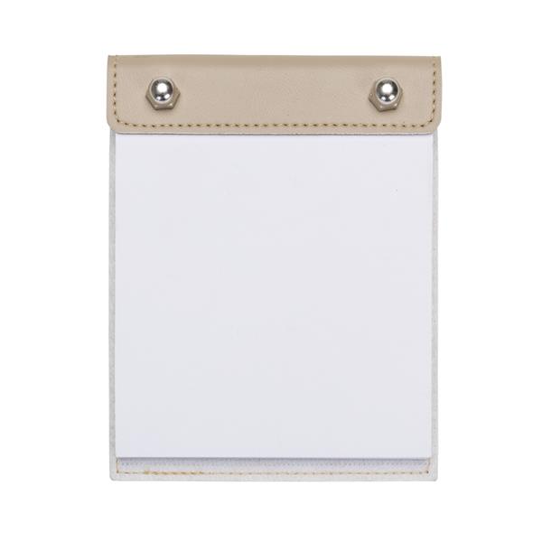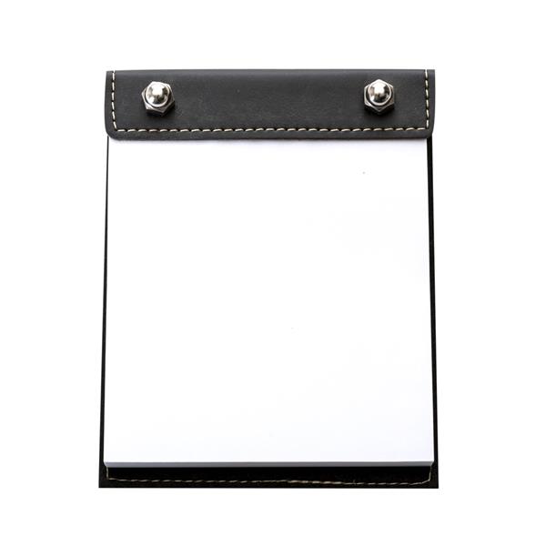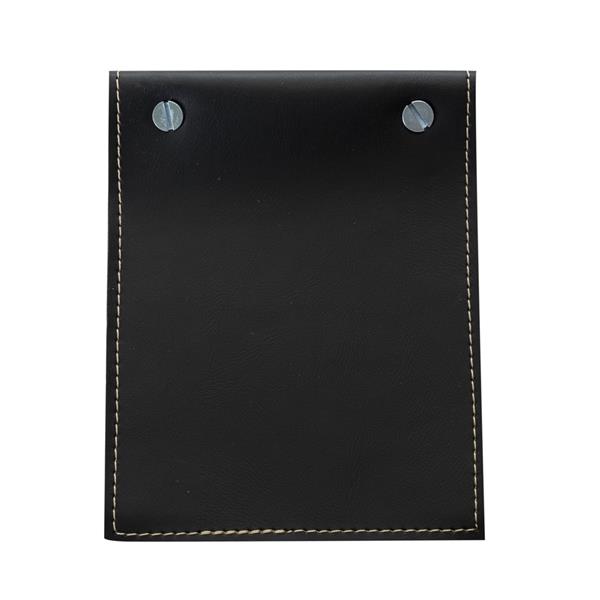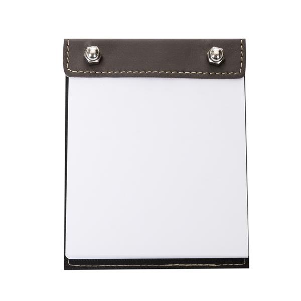 Bloco de anotações Bidins em couro sintético dois parafusos superiores. Possui aproximadamente 100 folhas brancas sem pauta.