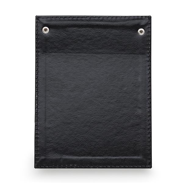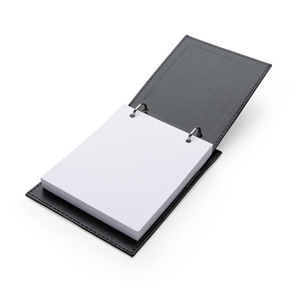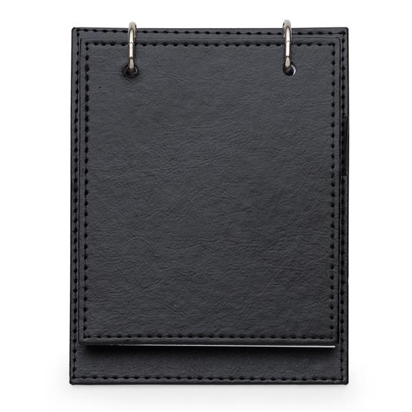 Bloco de anotação de mesa com trilho de ferro, material couro sintético. Possui suporte na lateral interna para colocar caneta(não acompanha) e aproximadamente 200 folhas sem pauta. Medidas aproximadas para gravação (CxL): 15,2 cm x 12,8 cm Tamanho total aproximado (CxL): 19,9 cm x 14,9 cm Peso aproximado (g): 413