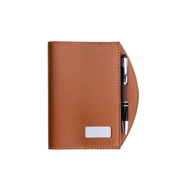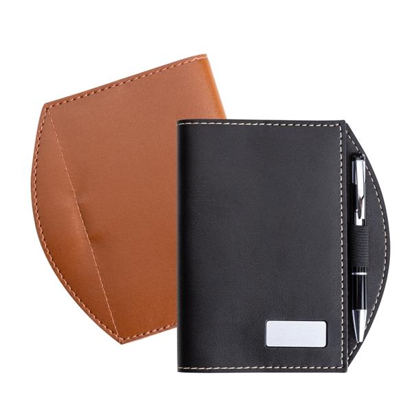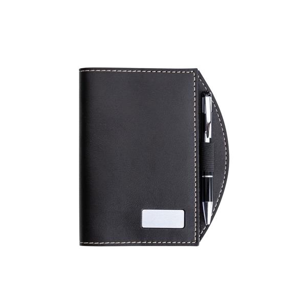 Bloco de anotações Bidins com plaquinha. Bloco em couro sintético com plaquinha frontal metálica e verso liso, possui aproximadamente 80 folhas brancas sem pauta, marca página de cetim, suporte elástico para caneta (não acompanha). Altura : 15,2 cm Largura : 12,8 cm Medidas aproximadas para gravação (CxL): 1,4 cm x 3,4 cm Peso aproximado (g): 284