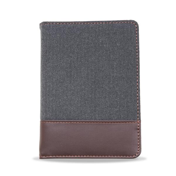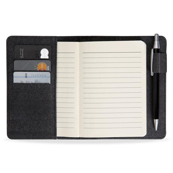 Bloco de anotações com suporte para caneta. Capa de feltro com detalhe inferior em couro sintético, parte interna possui 3 divisões para cartões, aproximadamente 80 folhas amarelas pautadas e contra capa com suporte em feltro para caneta(não acompanha caneta)