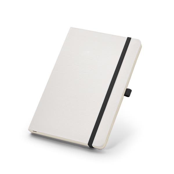 Caderno capa dura. Com porta esferográfica e 80 folhas não pautadas cor marfim. 137 x 210 mm