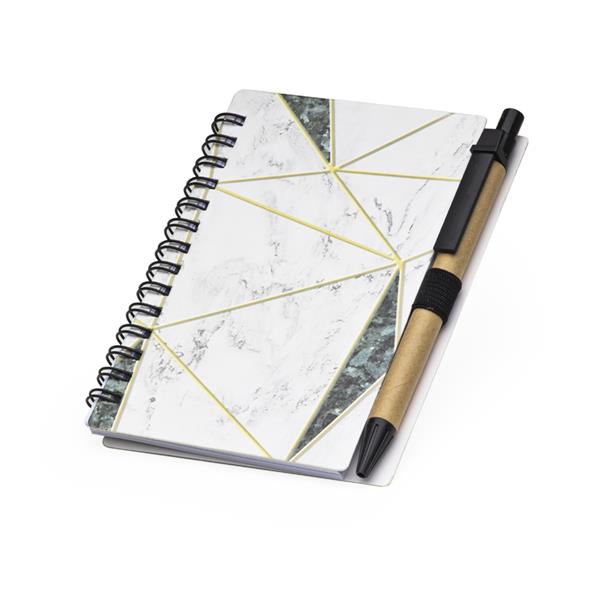 Caderneta com capa em papel com acabamento brilhoso e porta caneta, possui aproximadamente 70 folhas brancas pautadas. Acompanha caneta de papelão com detalhes plásticos, carga esferográfica azul e acionamento por clique. Altura : 13,5 cm Largura : 10,5 cm Espessura : 1,5 cm Peso aproximado (g): 80