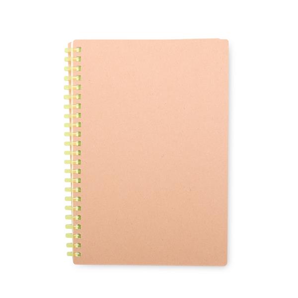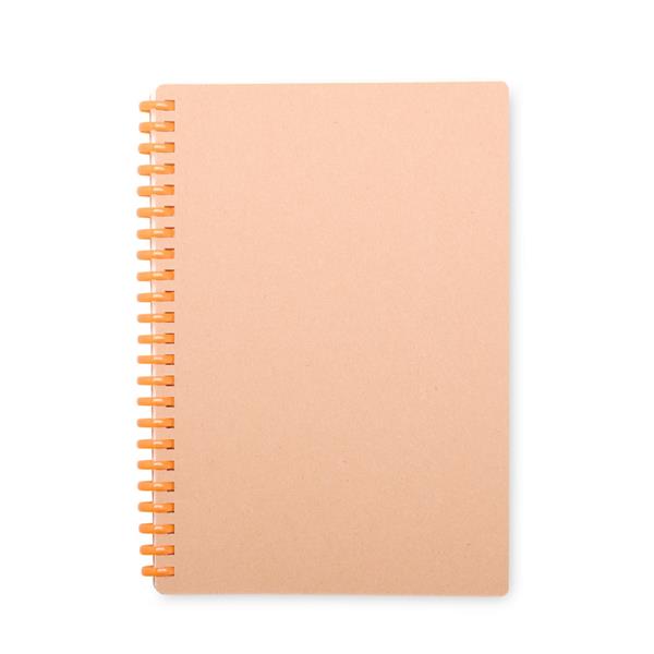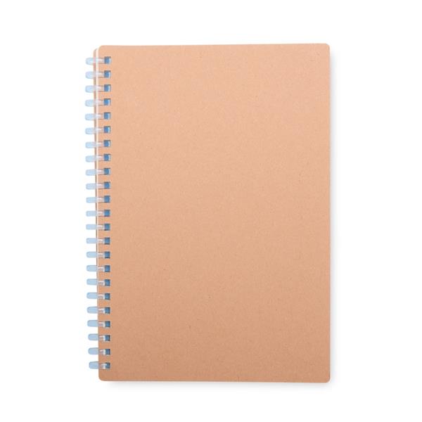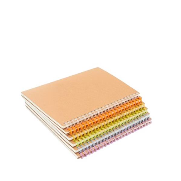 Caderneta com capa em kraft e encadernação em espiral de plástico. Possui cerca de 80 folhas brancas pautadas.