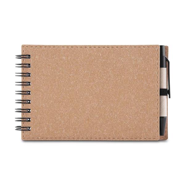 Mini bloco com capa em papelão e encadernação espiral wire-o, folhas sem pauta em 70g/m². Acompanha caneta confeccionada em papelão reciclado com detalhe em plástico.