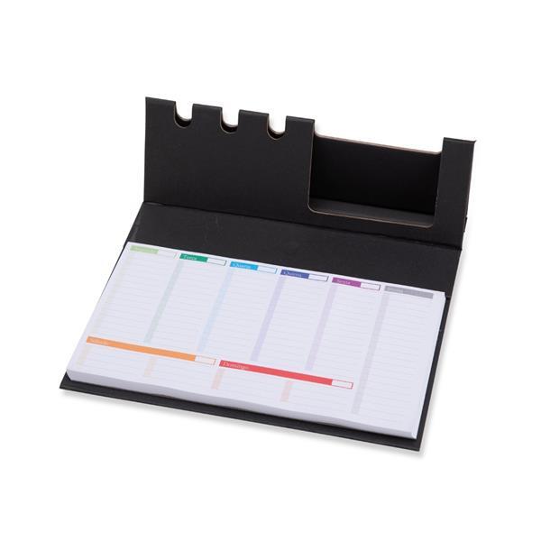 Bloco de notas com capa e estrutura em papelão, aproximadamente 98 folhas para anotações semanais e fechamento magnético, que permite montar porta-canetas e suporte para celular enquanto permanece aberto.