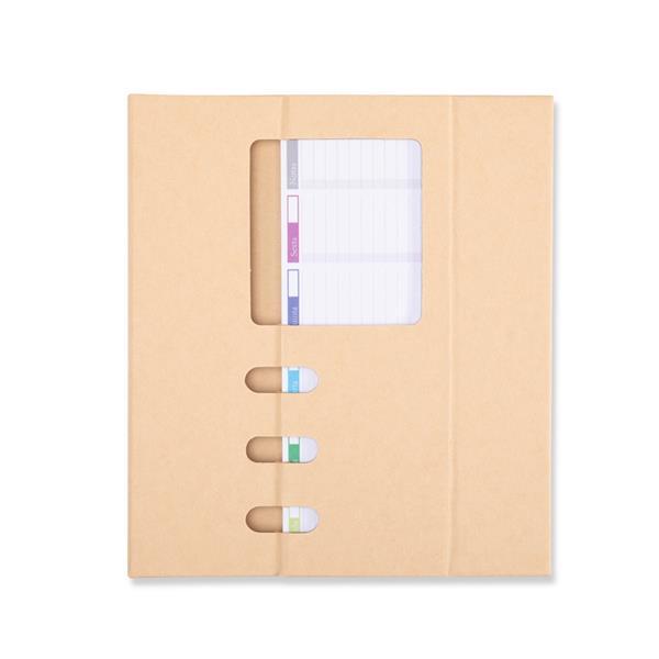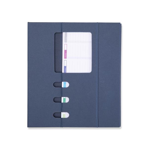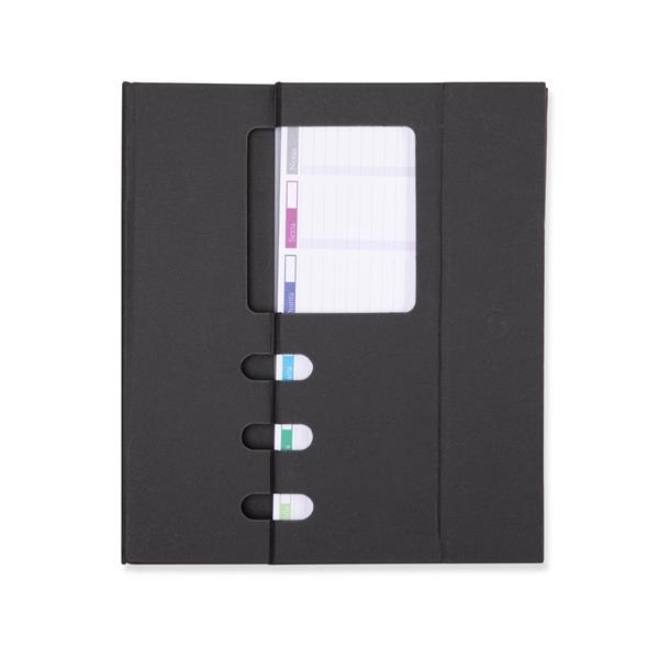 Bloco de notas com capa e estrutura em papelão, aproximadamente 98 folhas para anotações semanais e fechamento magnético, que permite montar porta-canetas e suporte para celular enquanto permanece aberto. Altura : 19,1 cm Largura : 22 cm Profundidade : 1,4 cm Peso aproximado (g): 5